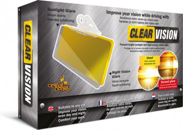 Het Clear Vision zonnescherm voor de auto heeft 2 verschillende schermen: het zwarte scherm is geschikt voor gebruik overdag, het oranje scherm is zowel overdag als ’s nachts te gebruiken. De zonneschermen verbeteren het zicht tijdens felle zon, regen, schemering en donkerte. Felle verlichting wordt verzacht en de ogen worden door de Clear Vision minder vermoeid. Daarnaast filtert deze zonneklep tot 99% van de stralen die schadelijk kunnen zijn voor de ogen.